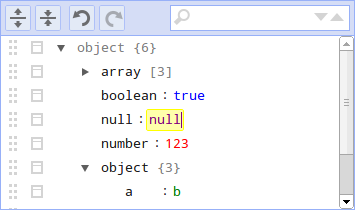 The field values in the editor are editable input fields. The fields can be dragged up and down using the dragarea on the left side of the fields. When a field is the last item of the children of an array or object, the field can also be dragged horizontally to move it in or out of the array or object.